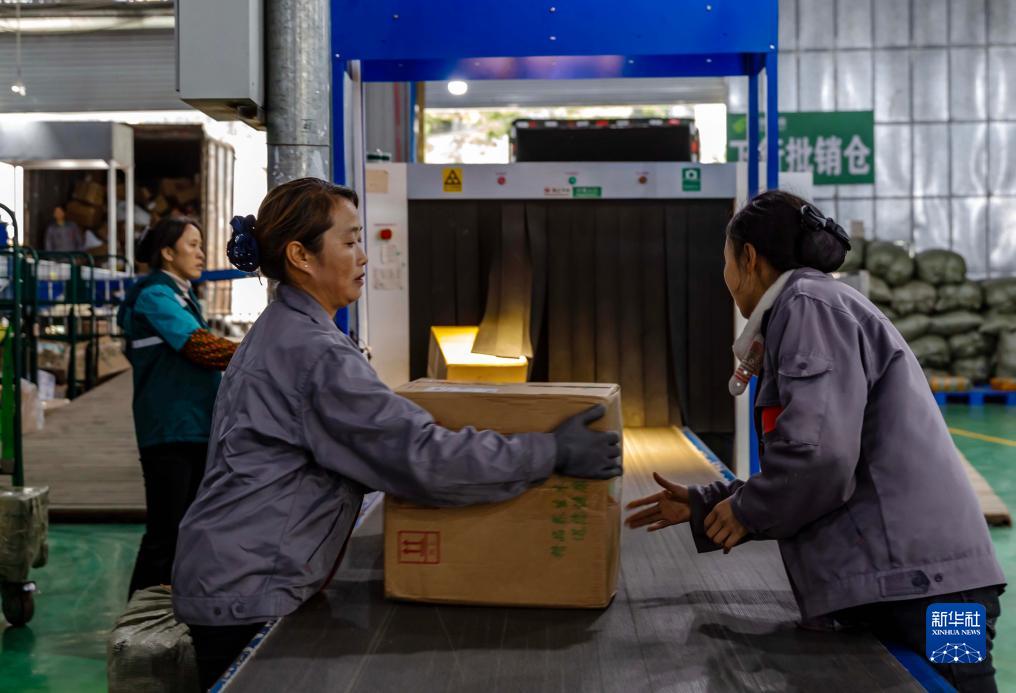 11月11日,工作人員在貴州省黔西市郵政快遞物流園分揀快遞。