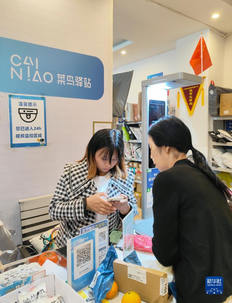 11月11日,貴州省遵義市新蒲新區幸福家園三區菜鳥驛站的工作人員(左)幫助市民查詢快件。