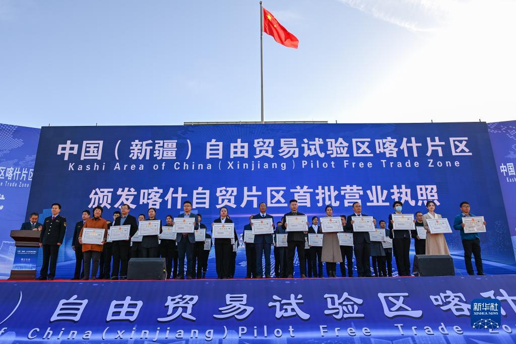 11月11日,在中國(新疆)自由貿易試驗區喀什片區揭牌儀式現場,首批入駐自貿片區的經營主體獲頒營業執照。