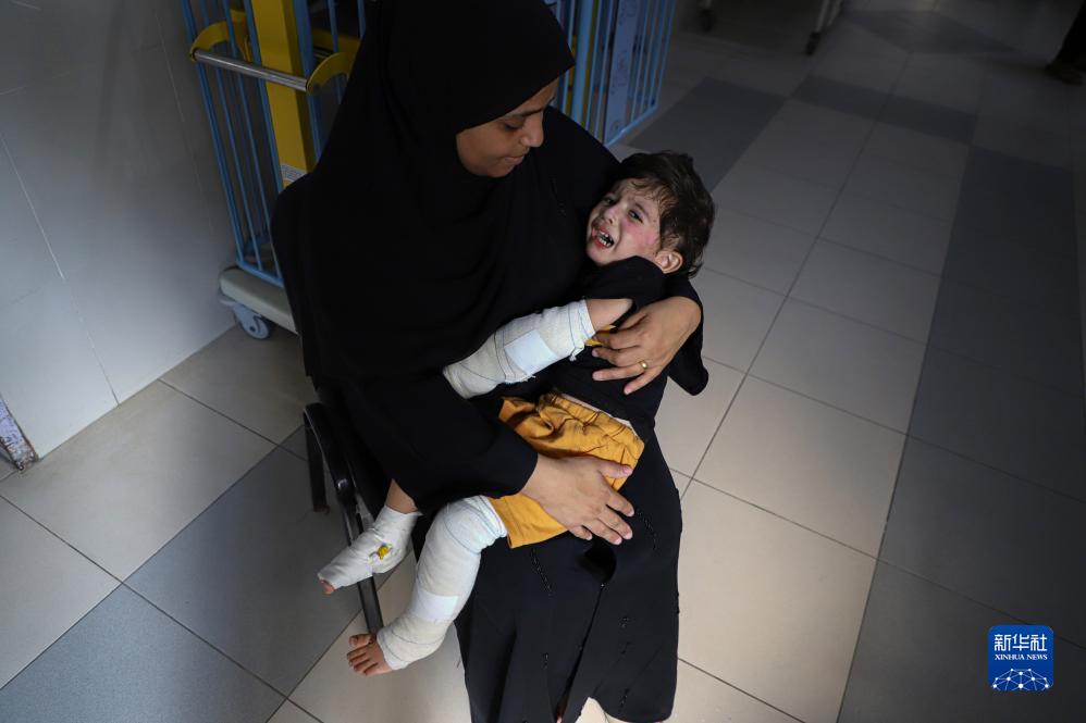 11月9日,在加沙地帶南部城市汗尤尼斯一處醫院,一名女子懷抱一名受傷的兒童。