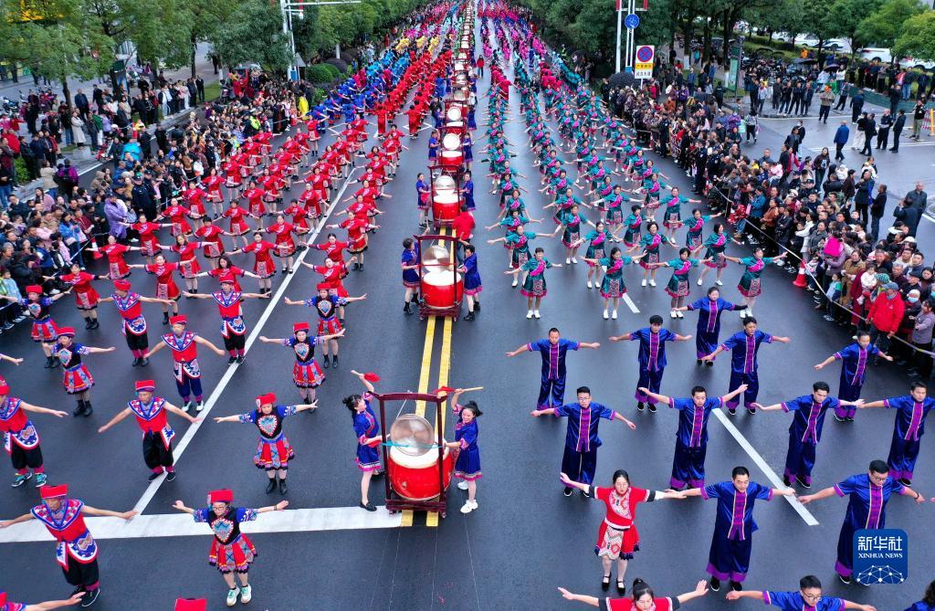 11月11日,擺手舞隊伍在湖北省來鳳縣城武漢大道上表演(無人機照片)。