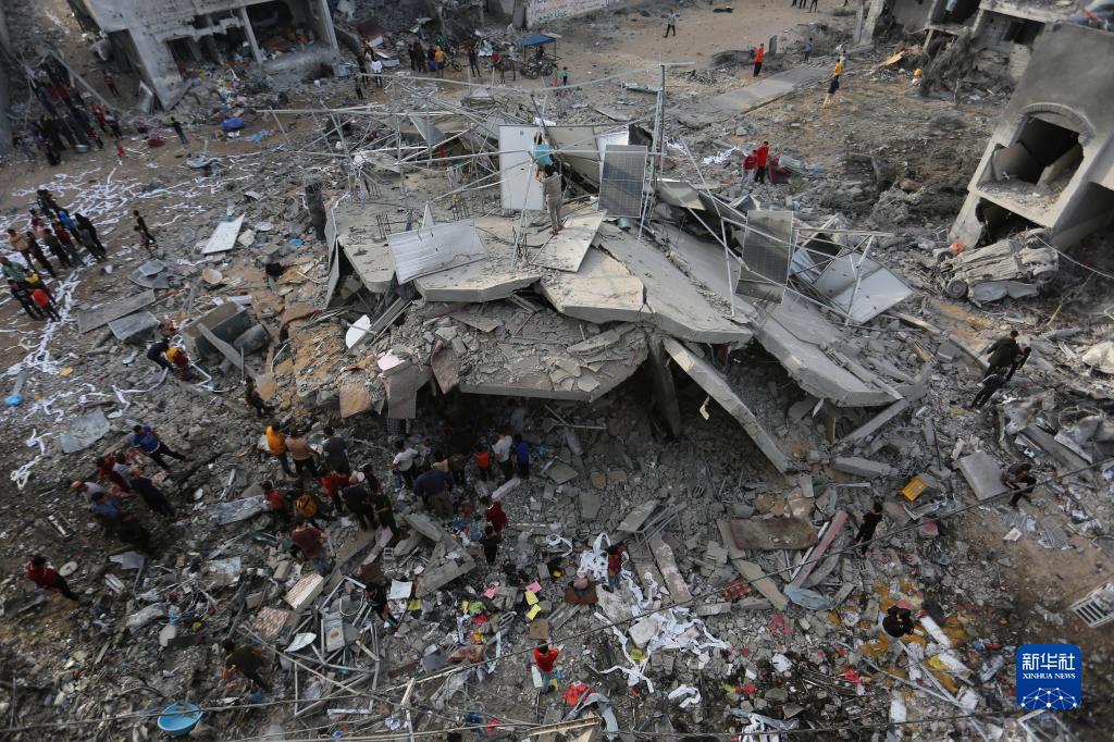 11月11日,在加沙地帶南部城市拉法,人們查看遭以色列襲擊後的建築。