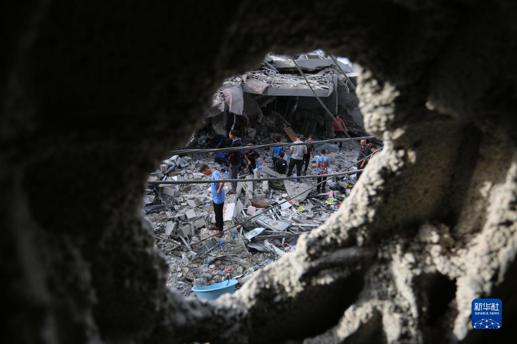 11月11日,在加沙地帶南部城市拉法,人們查看遭以色列襲擊後的建築。