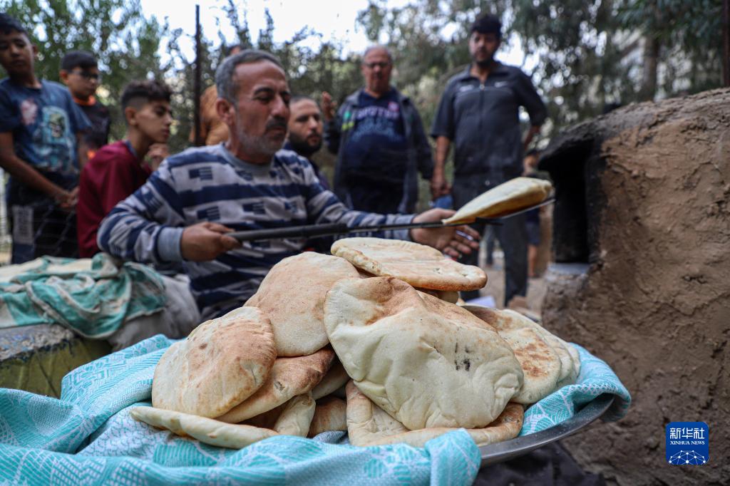 11月11日,在加沙地帶南部城市汗尤尼斯,志願者為無家可歸的巴勒斯坦人製作大餅。