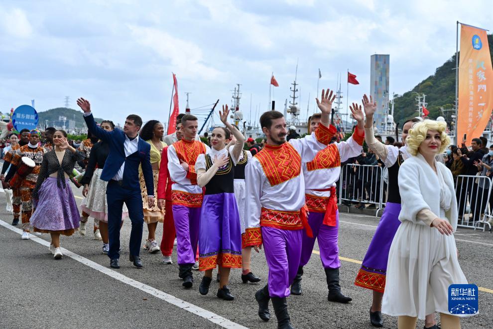 11月11日,外國民間藝術表演團隊在浙江省舟山市參加第八屆沈家門漁港民間民俗大會開幕式巡游展演。