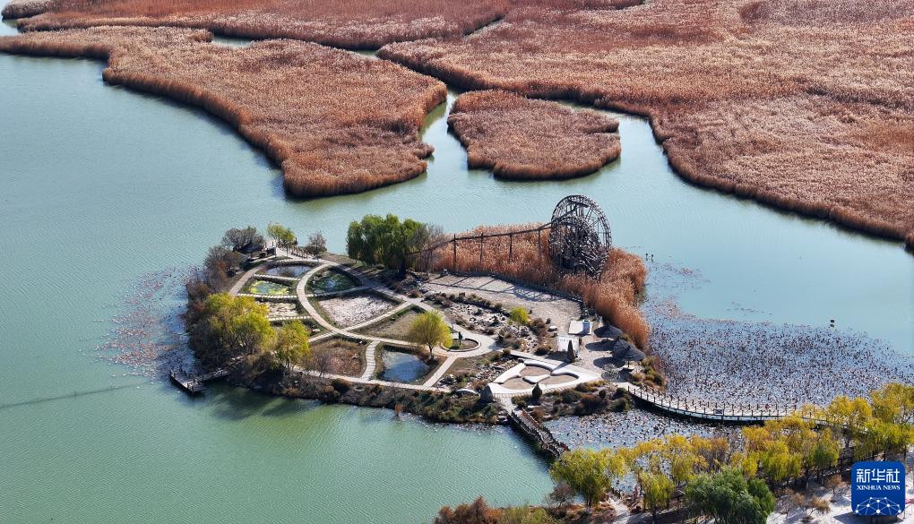 立冬節氣過後,位於寧夏銀川市興慶區的鳴翠湖國家濕地公園,金黃色的蘆葦隨風飄蕩,各色林木五彩斑斕,構成獨特的初冬濕地景觀。