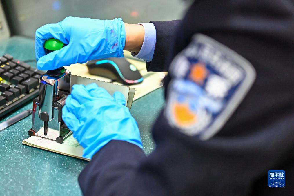 在新疆紅其拉甫口岸聯檢大廳,紅其拉甫邊檢站民警為出境旅客辦理邊檢手續(11月6日攝)。