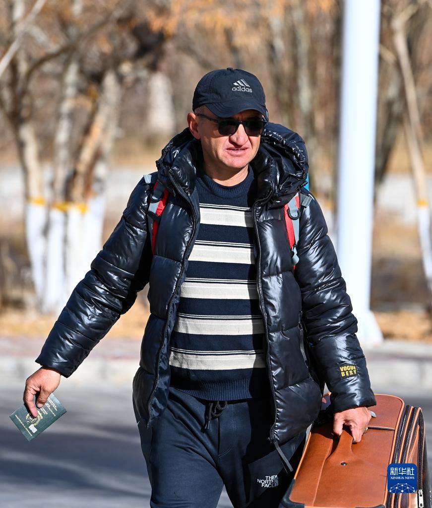 出境旅客攜帶行李和護照前往新疆紅其拉甫口岸聯檢大廳(11月6日攝)。
