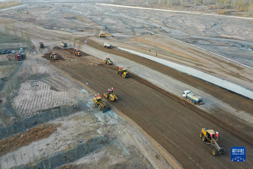 這是11月8日拍攝的G315線托帕至吐爾尕特口岸公路建設項目施工現場,項目建成後將提高口岸通關運輸效率(無人機照片)。