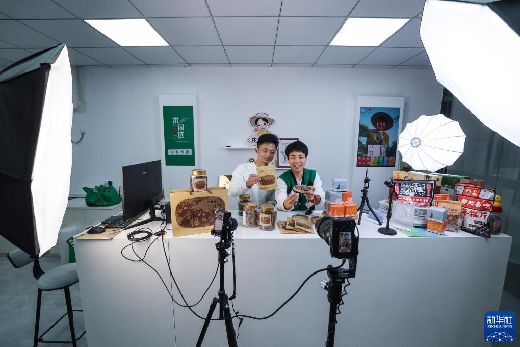 11月12日,浙江省諸暨市東白湖鎮上英村黨總支書記趙堅均、黨員志願者莊園(右)在“上英園夢”共富工坊直播間銷售香榧。