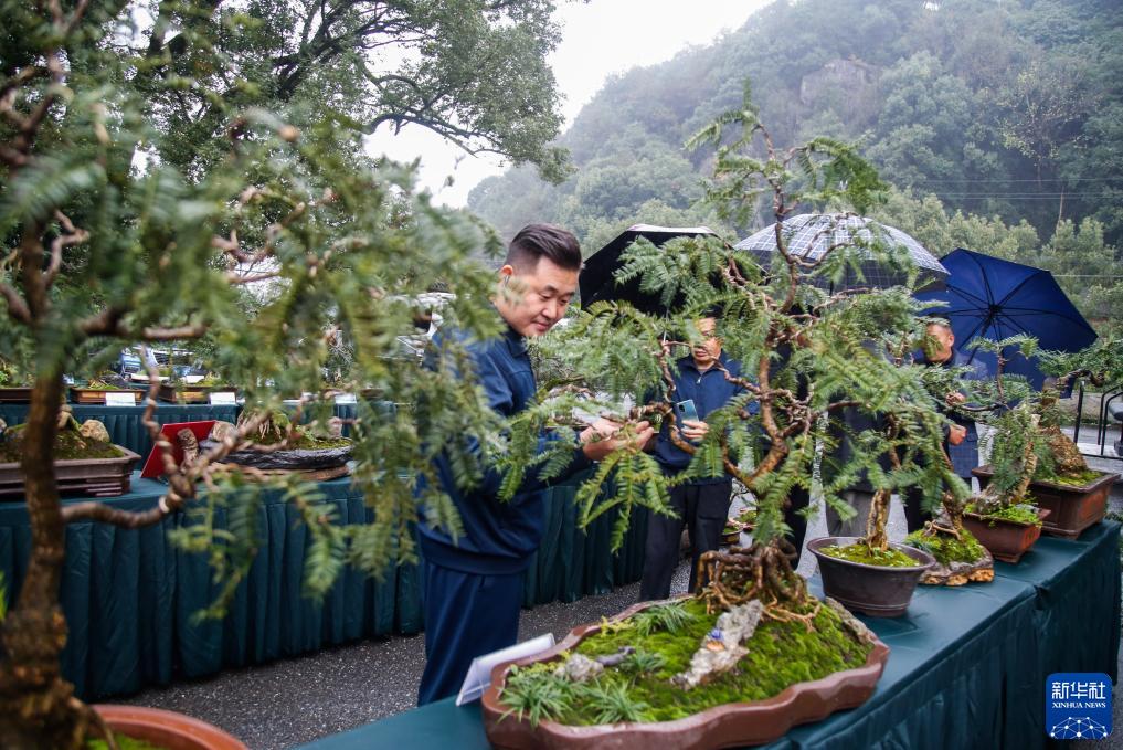 11月11日,在浙江省諸暨市東白湖鎮,香榧盆景愛好者、游客參觀香榧盆景展。