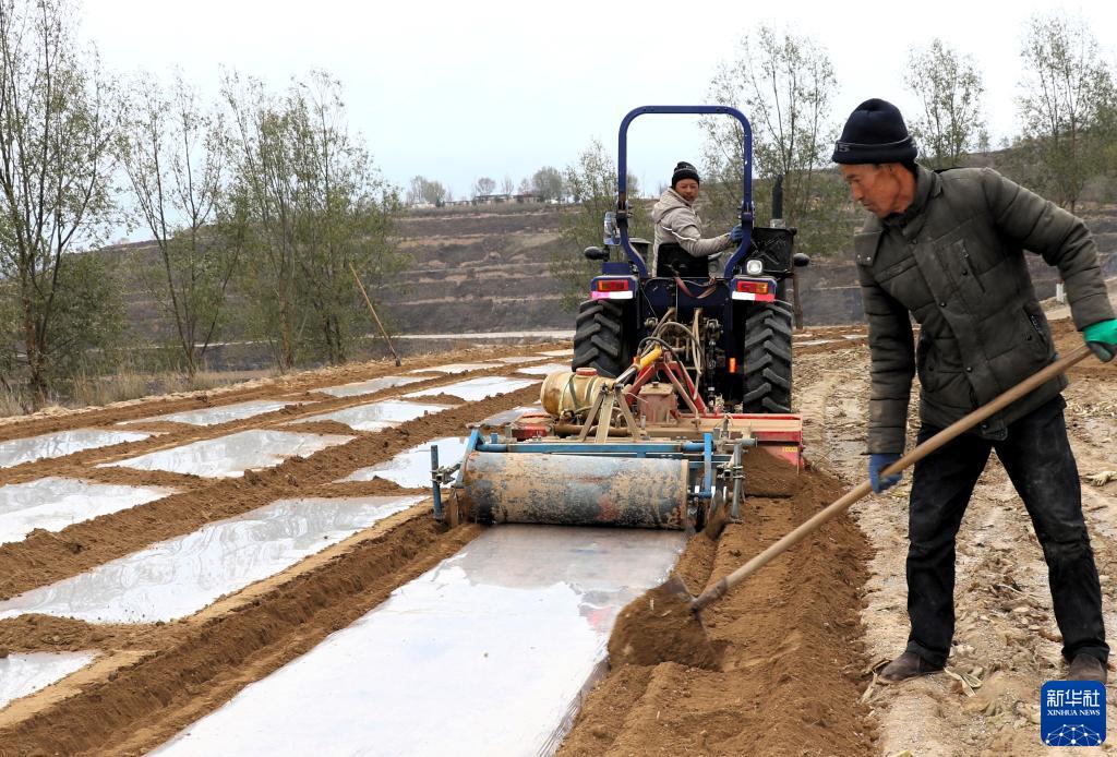 連日來,在位於黃土高原的甘肅省平涼市靜寧縣,農戶抓住秋冬季節降水較多、土壤墑情較好、地面尚未封凍的有利時機,對耕地進行覆膜作業,為來年春播打下基礎。