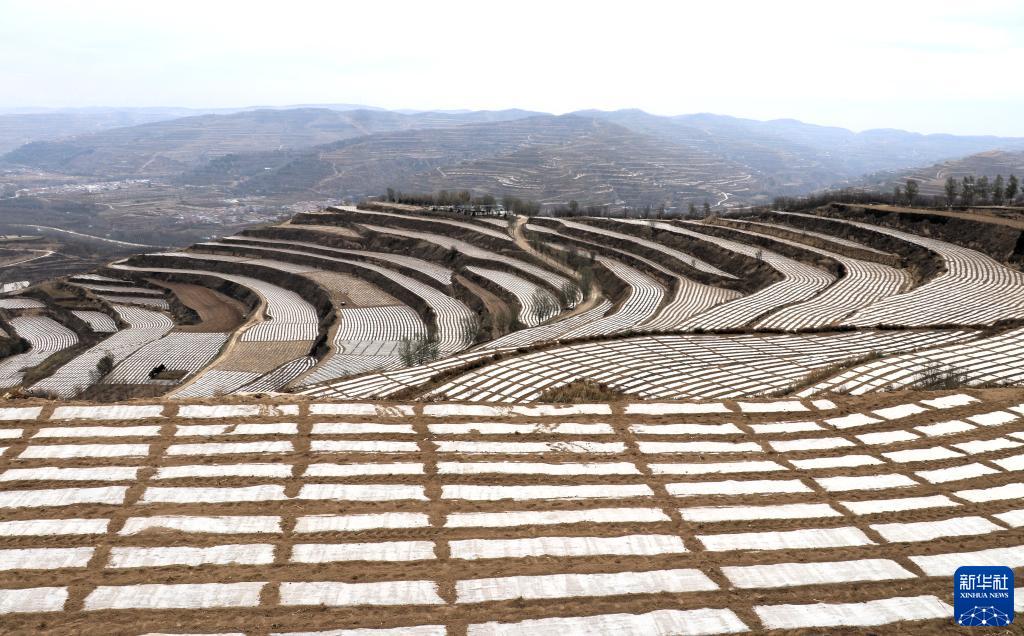 11月12日在靜寧縣古城鎮西灣村拍攝的覆膜後的梯田。