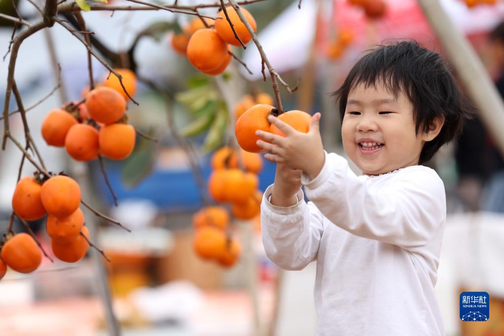 11月12日,小朋友在寧德市古田縣利洋村柿子園體驗摘柿子。