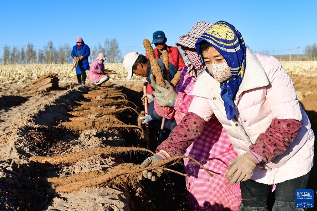 11月12日,在鄂托克前旗城川鎮章昂希裏村的沙地農田,農民采收白玉山藥。
