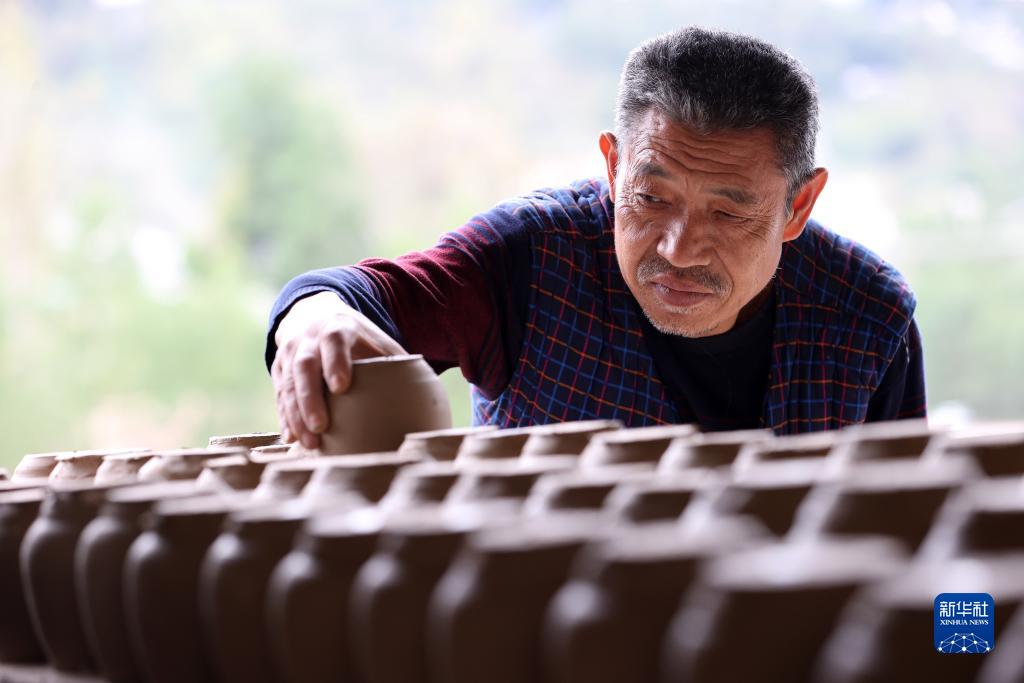 11月11日,在重慶市黔江區濯水鎮石雞坨土陶非遺工坊,工人檢查陶坯的乾濕度。