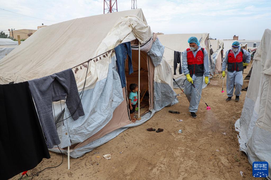 11月12日,工作人員在加沙地帶南部城市汗尤尼斯一處臨時難民營噴灑消毒液。