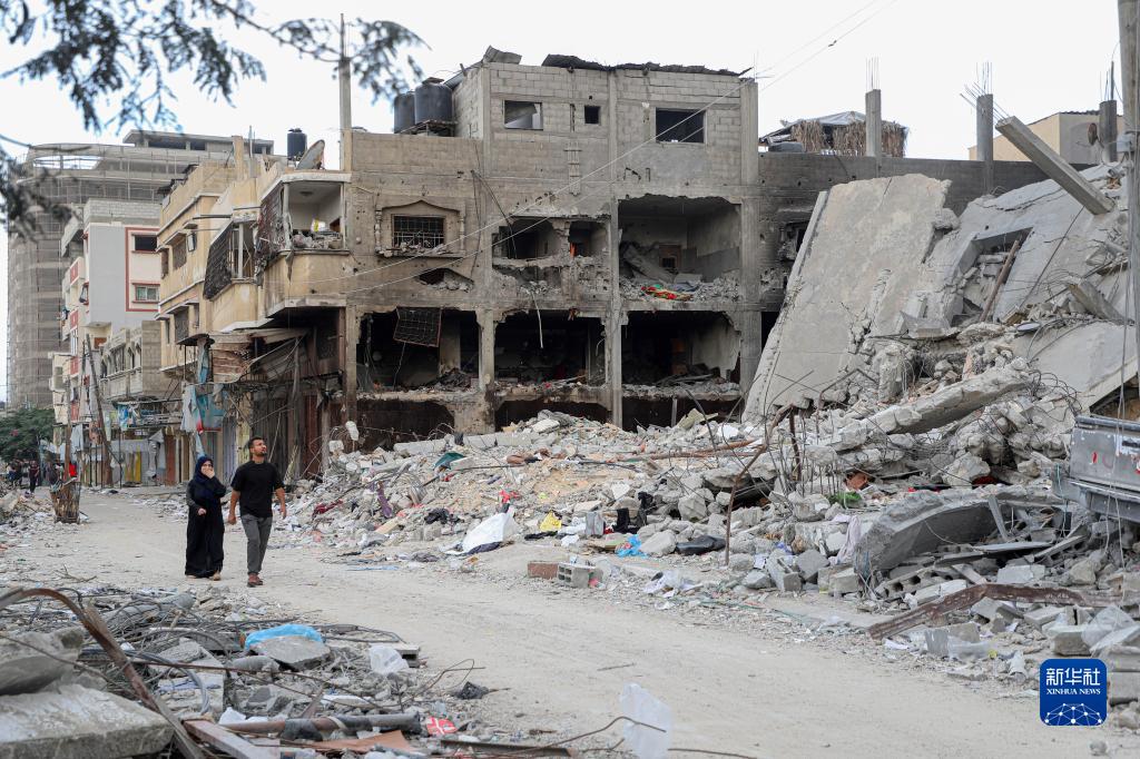 11月12日,行人經過加沙地帶南部城市汗尤尼斯損毀的建築。