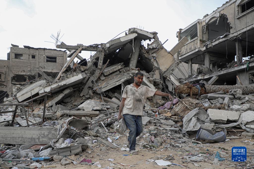 11月12日,一名男子在加沙地帶南部城市汗尤尼斯清理建築廢墟。