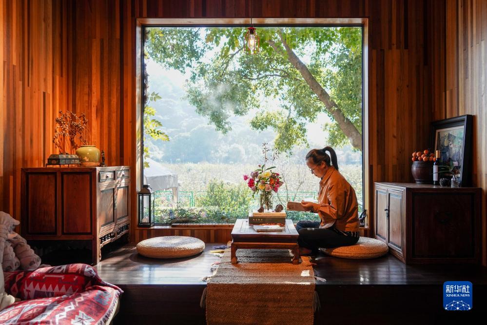 游客在江蘇省蘇州市通安鎮樹山村的一家民宿內休閒閱讀(11月2日攝)。