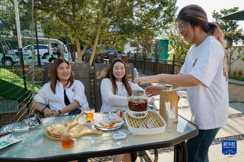 在樹山村的一家民宿內,工作人員(右)在為游客倒茶(11月2日攝)。