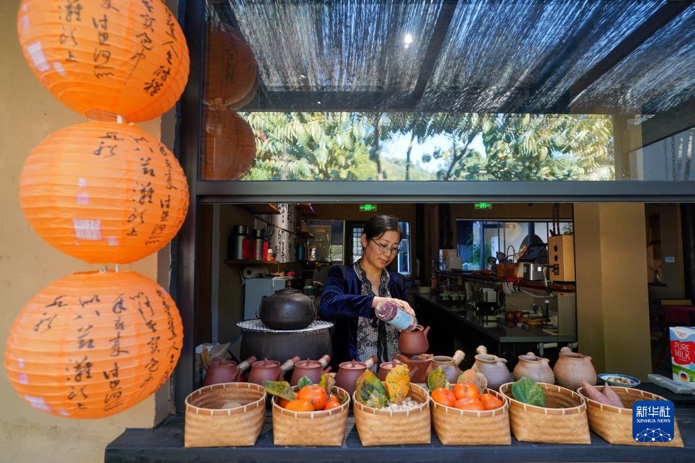 工作人員在樹山村的一家民宿內為游客製作茶飲(11月2日攝)。