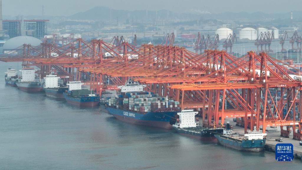 海輪在欽州港集裝箱碼頭裝卸貨物(11月12日攝,無人機照片)。