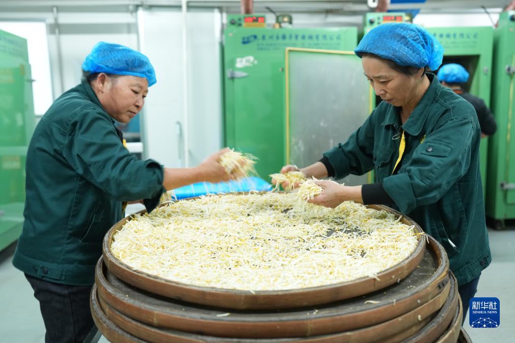 11月13日,在金華市婺城區浙江金佛手生物醫藥科技有限公司,工作人員在烘佛手絲,製成茶飲原料。