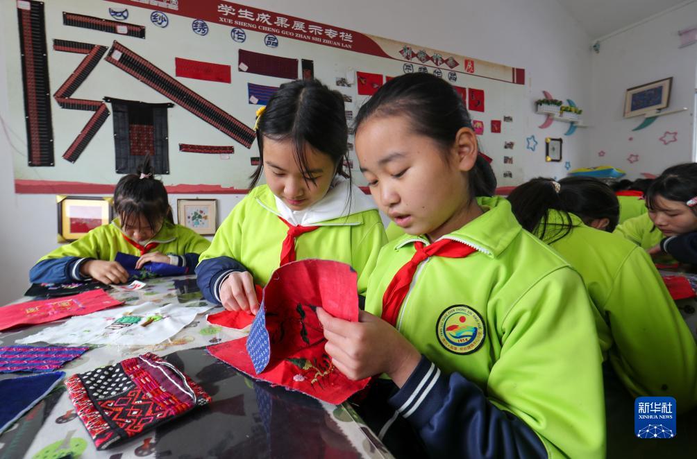 11月13日,在貴州省黔東南苗族侗族自治州施秉縣楊柳塘鎮中心小學,學生在苗繡課堂學習刺繡。