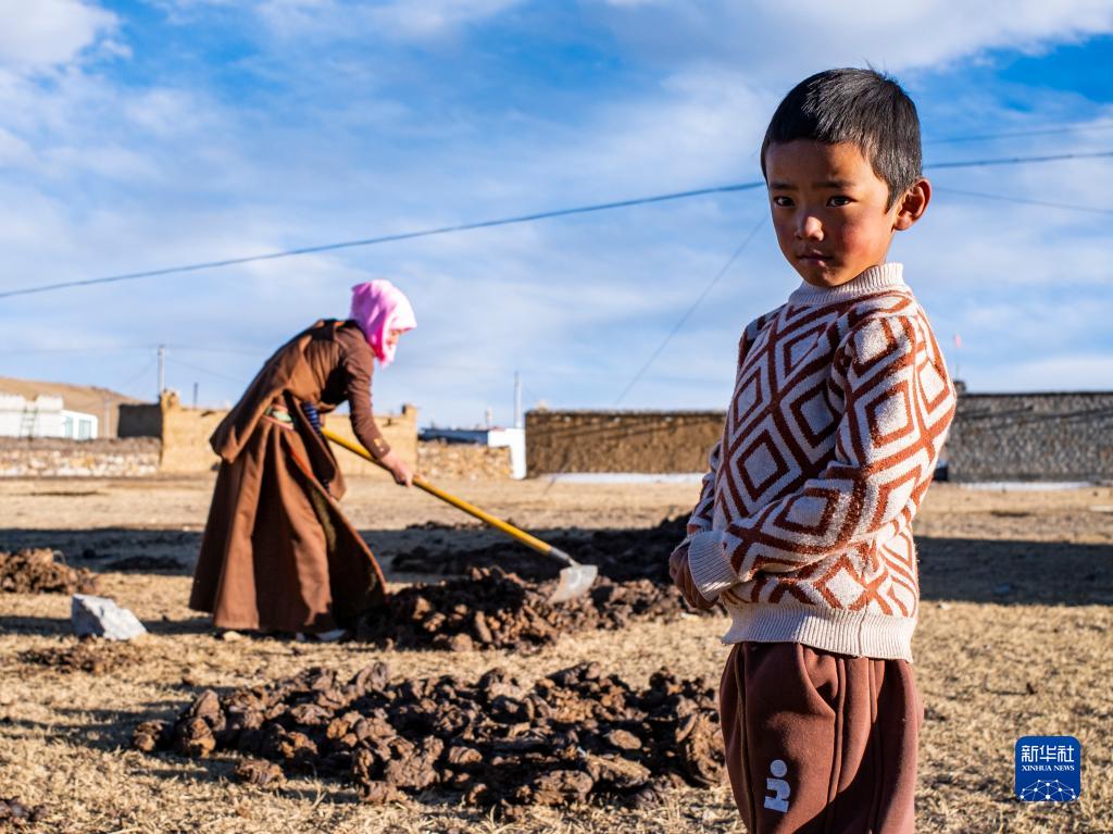 在西藏當雄縣納木湖鄉達布村的冬季放牧點,多吉扎西(右)在幫助媽媽芝嘎措姆製作取暖用的牛糞餅(11月10日攝)。