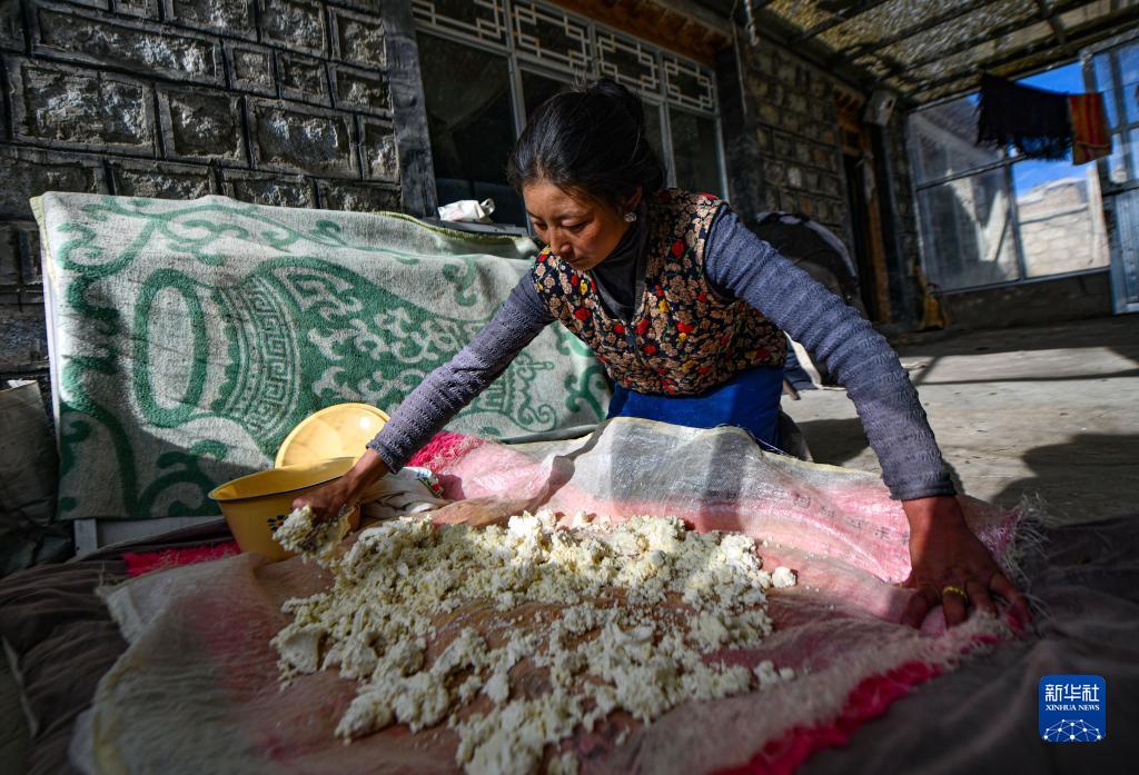 在西藏當雄縣納木湖鄉達布村的冬季放牧點,牧民在製作奶渣(11月10日攝)。
