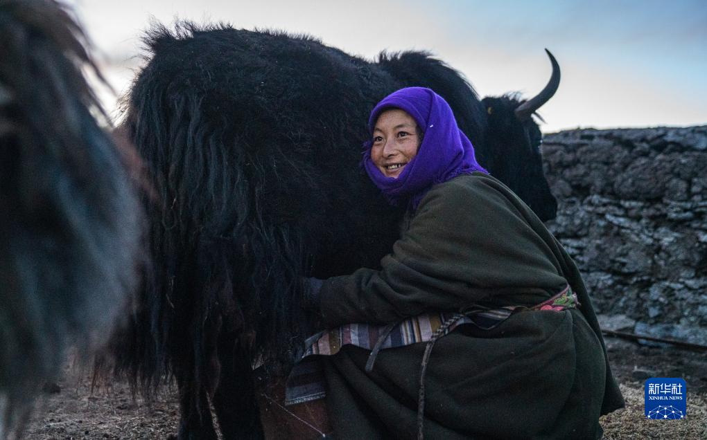 在西藏當雄縣納木湖鄉達布村的冬季放牧點,雲丹的妻子同吉在擠牛奶(11月10日攝)。