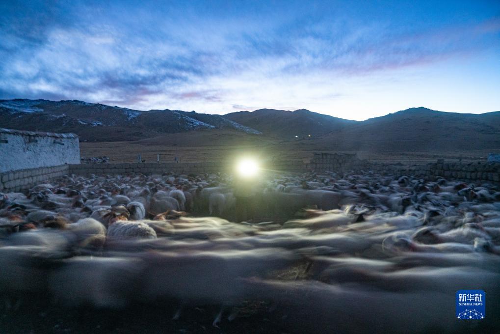 在西藏當雄縣納木湖鄉達布村的冬季放牧點,雲丹的父親玉珠在清點羊群數量(11月10日攝)。