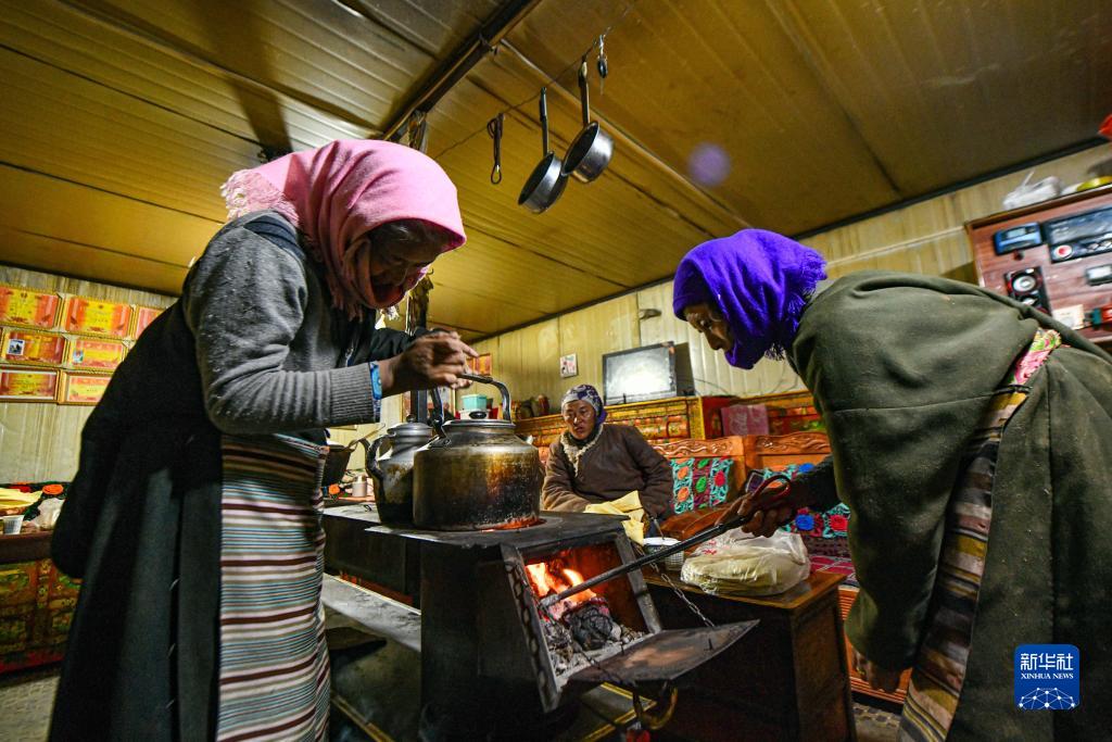 在西藏當雄縣納木湖鄉達布村的冬季放牧點,雲丹的妻子同吉(右)和朋友芝嘎措姆在燒水(11月10日攝)。