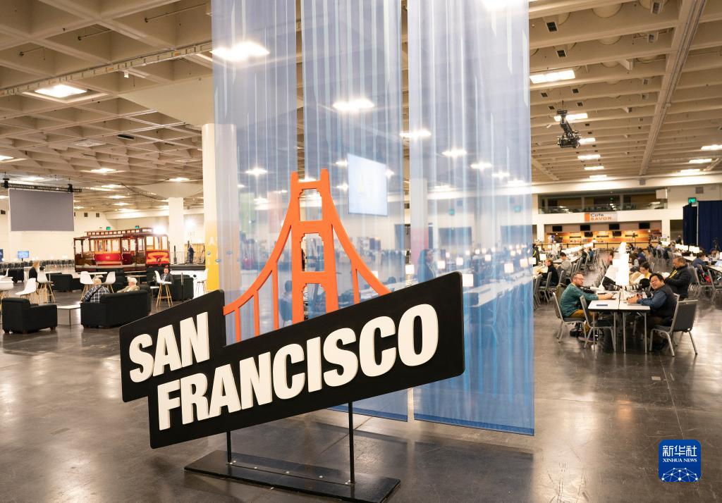 11月12日,記者在美國舊金山的2023年亞太經合組織會議國際媒體中心內工作。