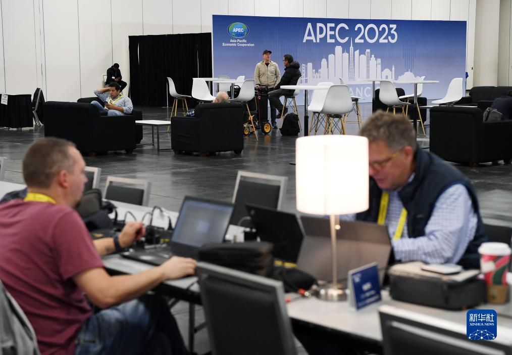 11月12日,記者在美國舊金山的2023年亞太經合組織會議國際媒體中心內工作。