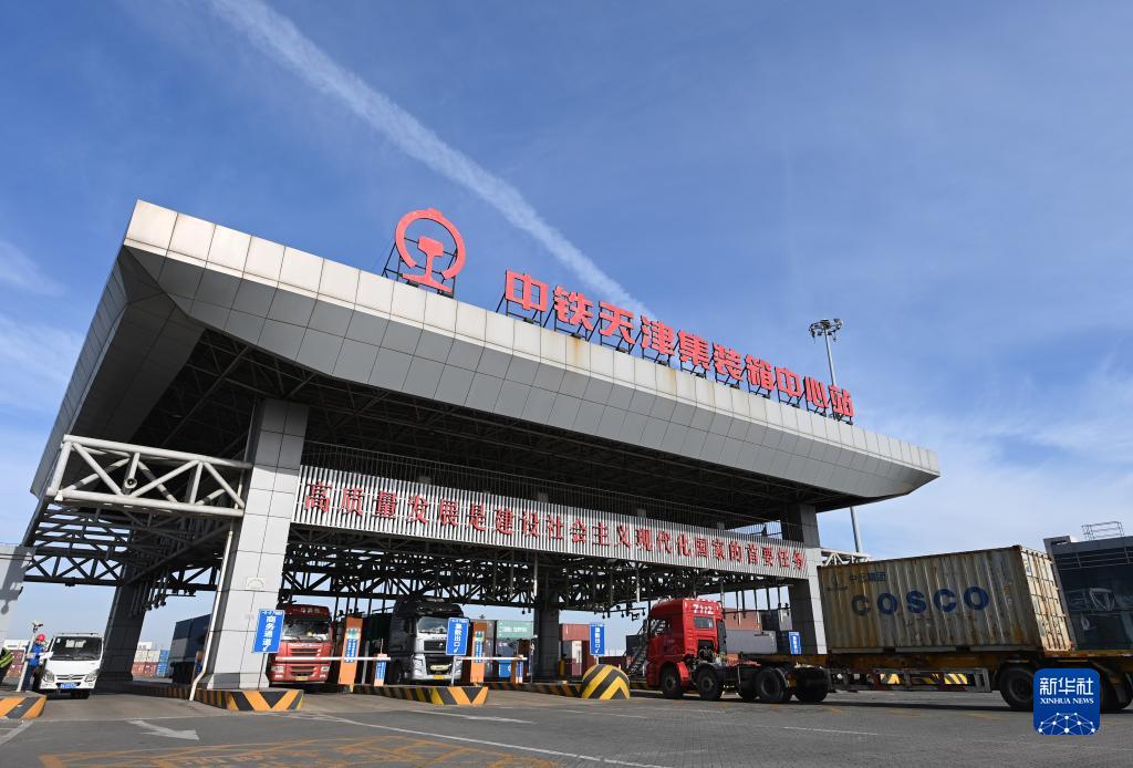 11月13日,裝載集裝箱的卡車駛入中鐵天津集裝箱中心站。
