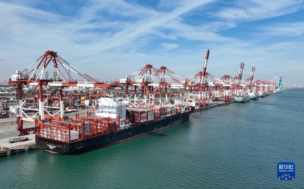 集裝箱貨輪停靠在天津港歐亞國際集裝箱碼頭(11月13日攝,無人機照片)。