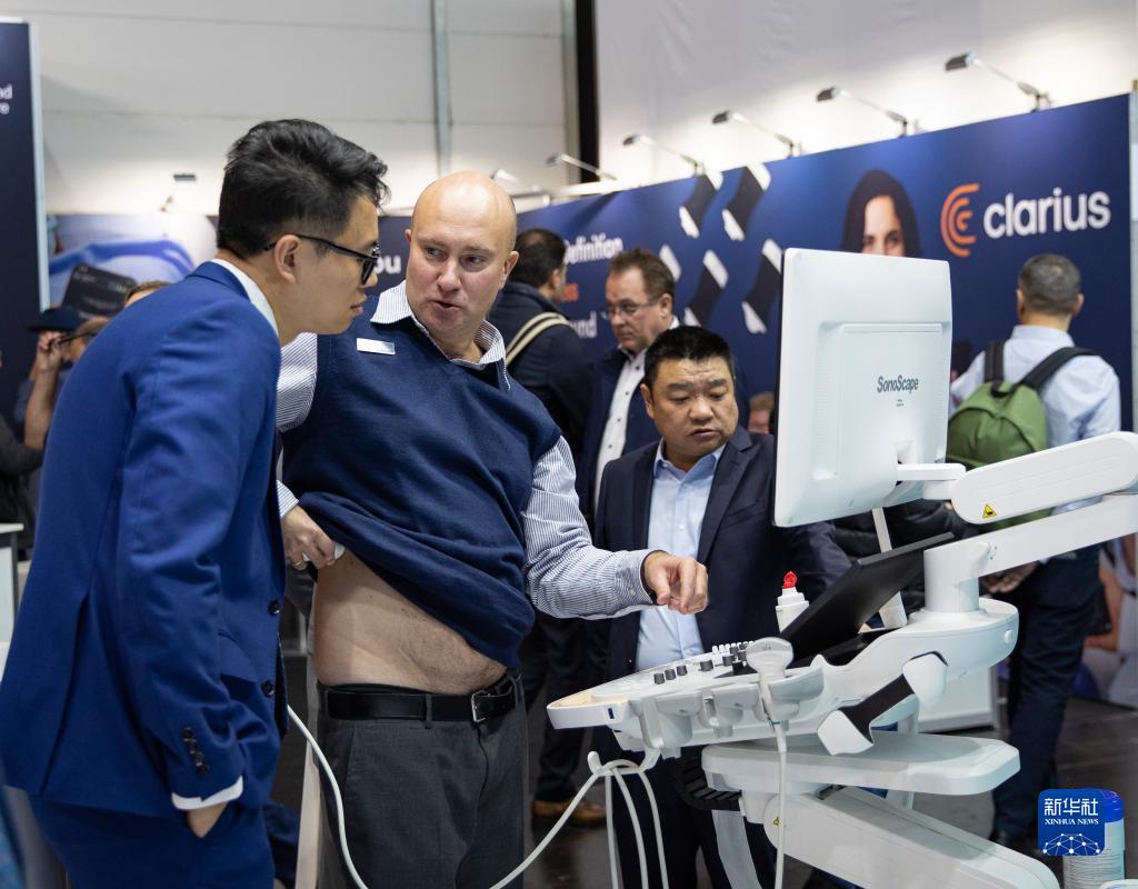 11月13日,在德國杜塞爾多夫國際醫療器械設備展,參觀者在開立醫療展位體驗超聲設備。新華社記者 張帆 攝