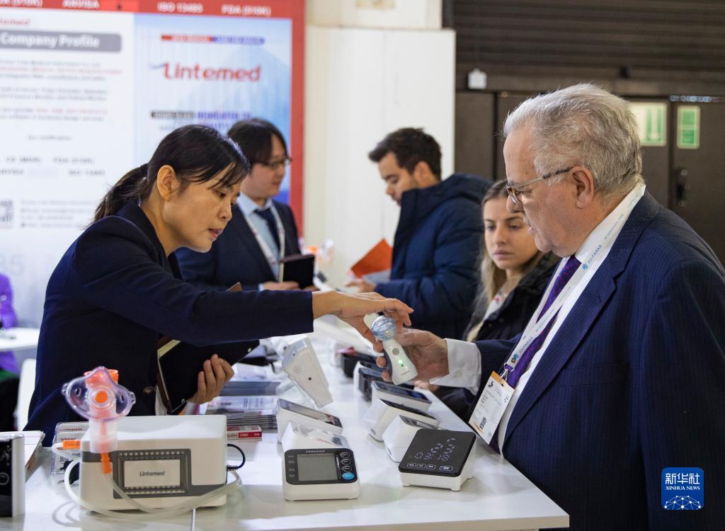 11月13日,在德國杜塞爾多夫國際醫療器械設備展,參觀者在凌特公司展位諮詢洽談。新華社記者 張帆 攝