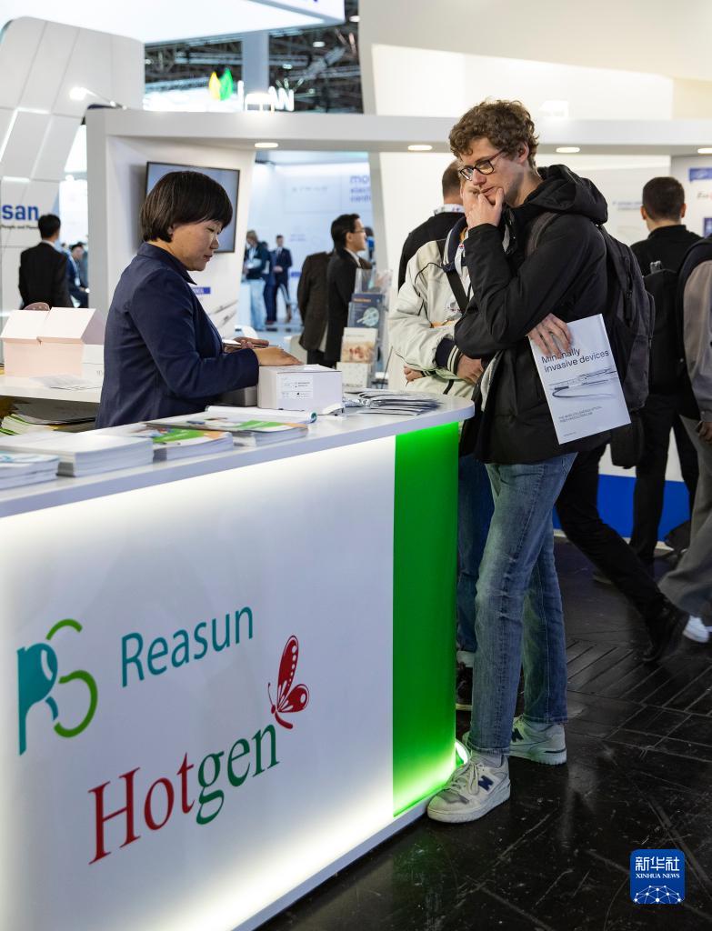 11月13日,在德國杜塞爾多夫國際醫療器械設備展,參觀者在熱景生物展位諮詢洽談。新華社記者 張帆 攝