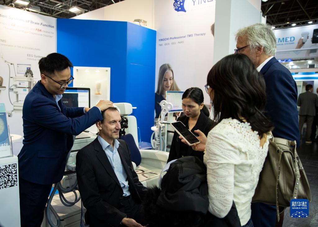 11月13日,在德國杜塞爾多夫國際醫療器械設備展,參觀者在英智醫療展位體驗經顱磁刺激儀。新華社記者 張帆 攝