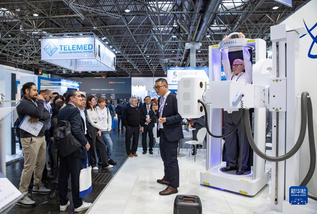 11月13日,在德國杜塞爾多夫國際醫療器械設備展,參觀者觀看安健科技負重位CT産品海外發布。新華社記者 張帆 攝