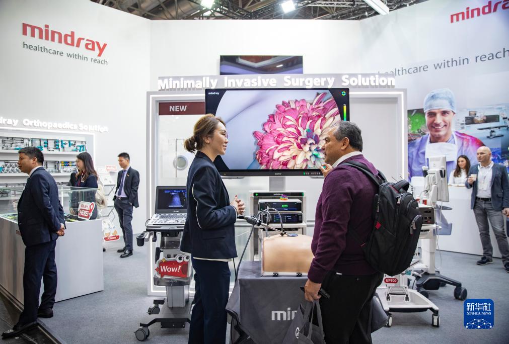 11月13日,在德國杜塞爾多夫國際醫療器械設備展,參觀者在邁瑞醫療展位諮詢洽談。新華社記者 張帆 攝