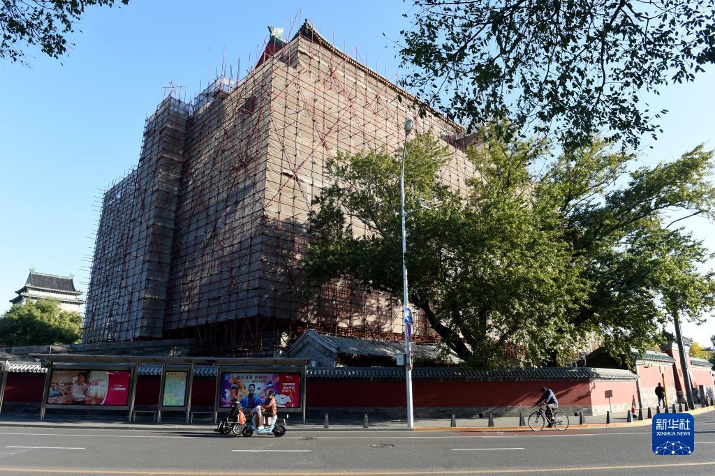 北京鐘樓(左)和修繕中的北京鼓樓(11月7日攝)。鐘鼓樓位於北京中軸線的最北端,兩樓前後縱置,氣勢雄偉。作為元、明、清三代都城的報時中心,至今已有700多年的歷史。