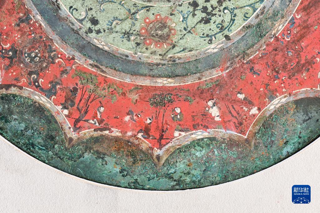 西漢彩繪人物車馬鏡局部彩繪圖案“宴飲”(8月25日攝)。新華社記者 李賀 攝