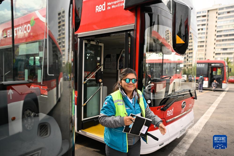 11月2日,在智利首都聖地亞哥,520路新能源公交車司機寶拉完成一個班次後回到總站。