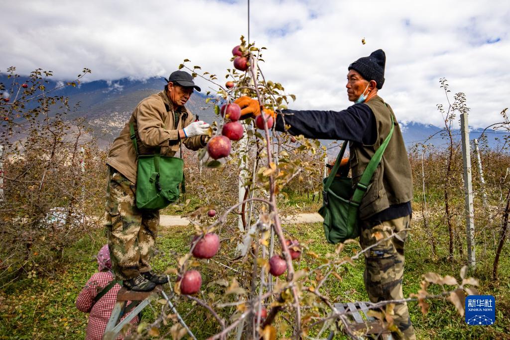 米林市羌納鄉西藏林芝現代蘋果標準化園區內,農民在採摘蘋果(11月13日攝)。