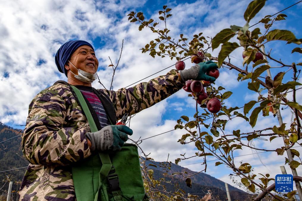 米林市羌納鄉西藏林芝現代蘋果標準化園區內,農民在採摘蘋果(11月13日攝)。