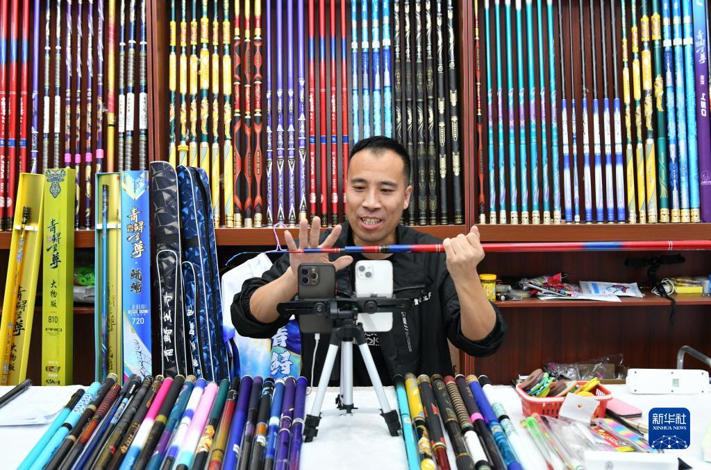 11月14日,在河北省肅寧縣一家魚竿漁具生産企業直播間,主播利用直播平台推介産品。